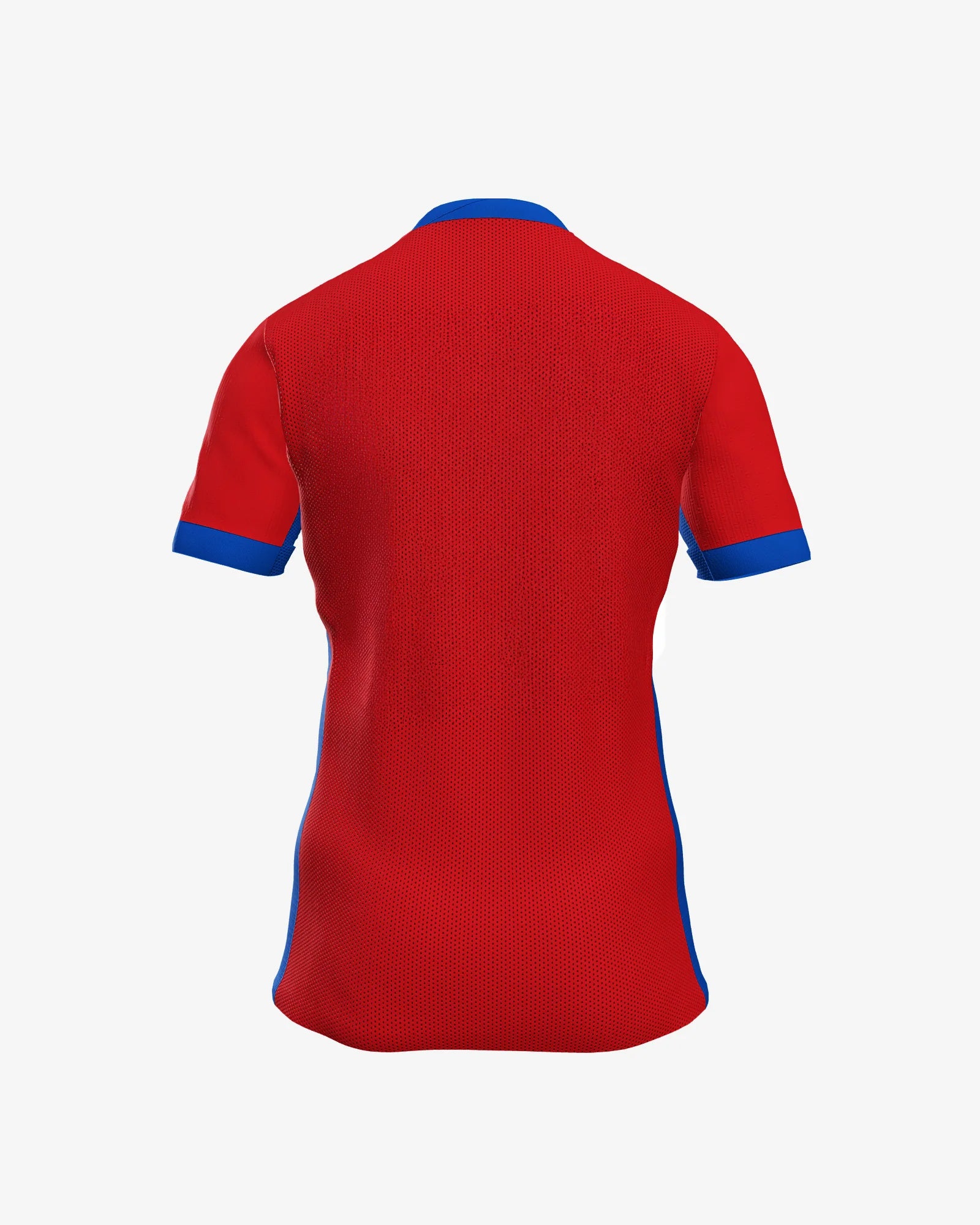 Echipamentul de deplasare este uniform, complet rosu, cu detalii discrete în albastru — o alegere elegantă, care asigură un contrast vizibil pe teren și un look modern